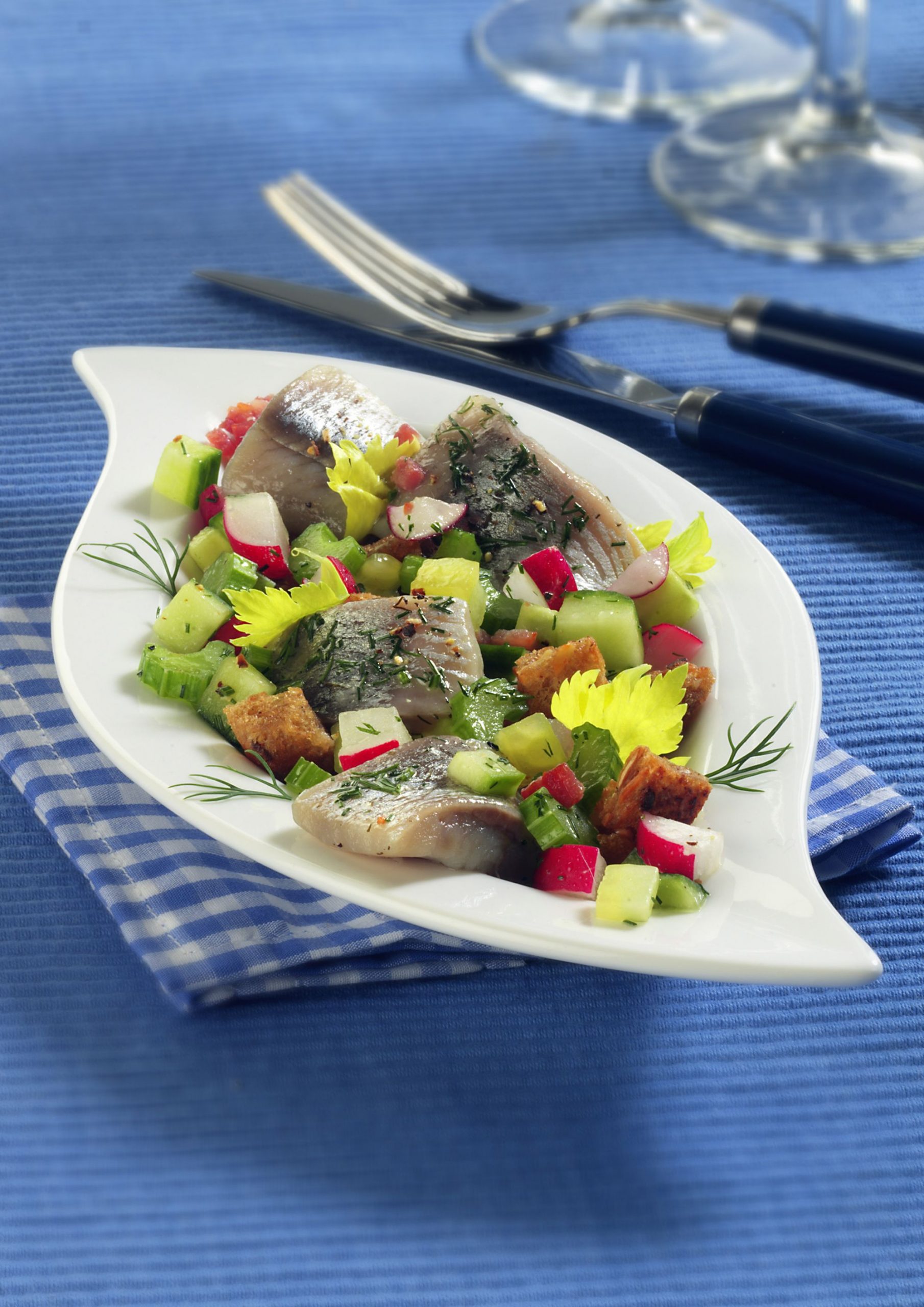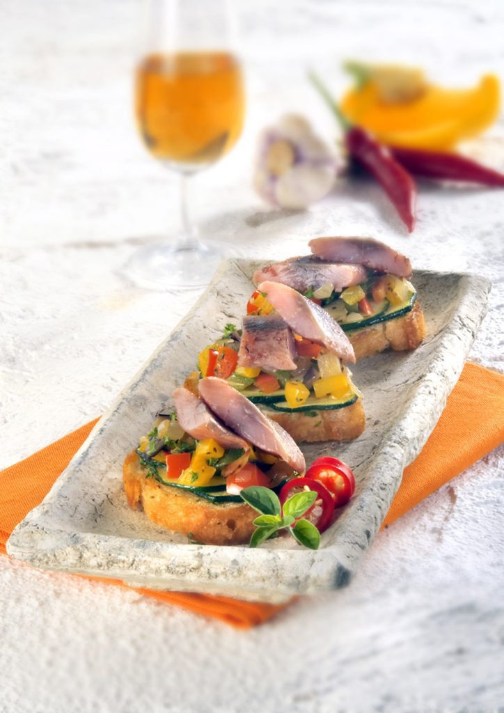 Den kalten Gemüsesalat auf die warmen Baguettescheiben geben und einige Kräuter-Matjesfiletstreifen darauf verteilen.