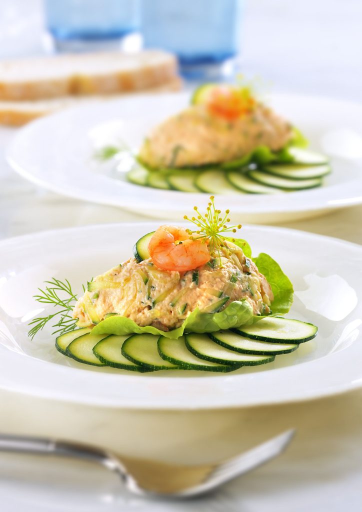 Zucchini putzen, waschen und fein raspeln. Gelatine in kaltem Wasser einweichen. Krabben-Creme, Crème fraîche und Zucchini verrühren. Mit Salz und Tomatenmark abschmecken.