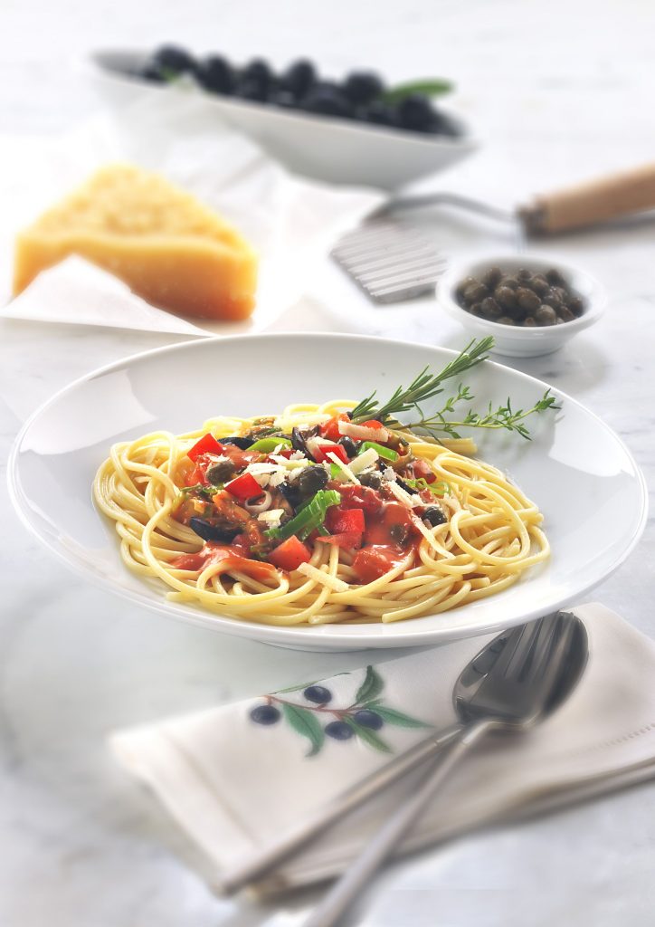 In der Zwischenzeit Spaghetti in kochendem Salzwasser nach Packungsangabe garen. Oliven, Kapern und Thunfisch-Creme in die Sauce geben, verrühren und mit Salz und Pfeffer abschmecken. Sauce über die Spaghetti geben, mit Parmesan-Käse bestreuen und mit den zurück gelegten Thymian- und Rosmarinzweigen dekorieren.